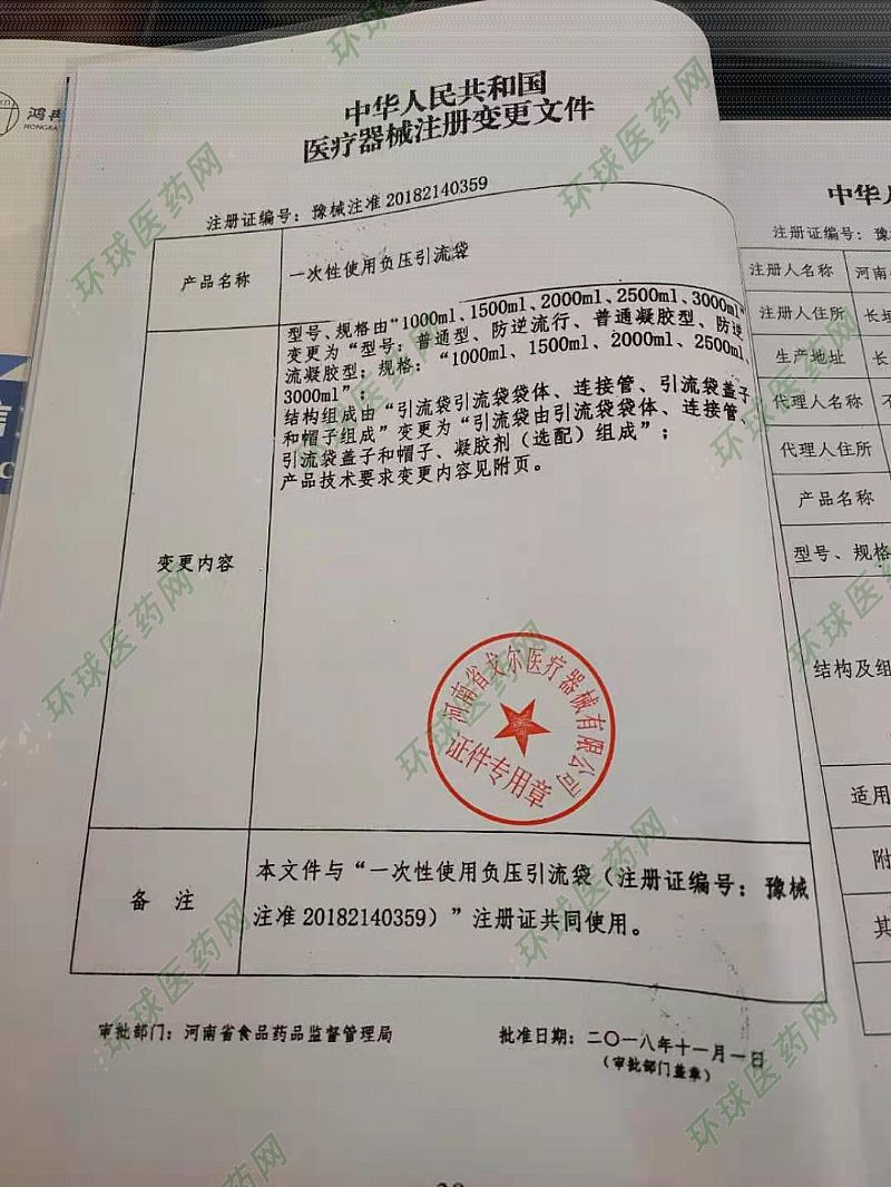 | 補(bǔ)充說(shuō)明 | 產(chǎn)品名稱(chēng):一次性使用負(fù)壓引流袋 型號(hào)、規(guī)格:1000mI、100ml、2000m1、2500m1、3000ml 結(jié)構(gòu)及組成:本產(chǎn)品由引流袋袋體、連接管、引流袋蓋子和帽組成。 適用范圍:臨床上,在體外與負(fù)壓引流裝置和引流導(dǎo)管連接以收集引流液 體。 |