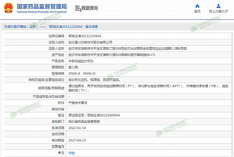 | 補(bǔ)充說明 | XN06系列由測試儀主機(jī)、測試杯組成 XN06-II 血凝儀,儀器測試通道為2個 XN06-IV血凝儀,儀器測試通道為4個 有效期至 2027-04-23 |