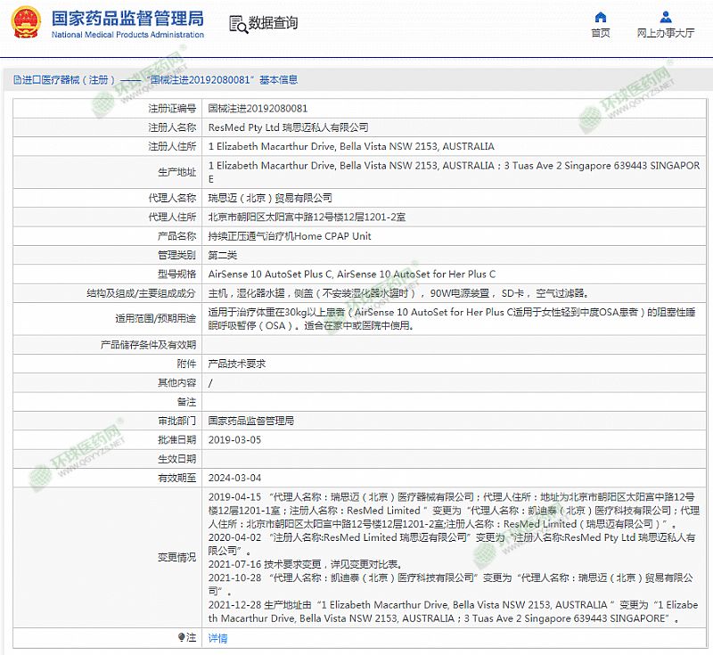 生產(chǎn)企業(yè): ResMed Pty Ltd 瑞思邁私人有限公司