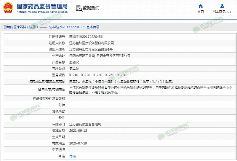 | 產(chǎn)品用途 | 與江蘇魚躍醫(yī)療設(shè)備股份有限公司生產(chǎn)的魚躍血糖試紙配套,用于醫(yī)院和家庭檢測毛細(xì)血管全血或靜脈全血中的葡萄糖濃度。 有效期至 2026-07-29 |