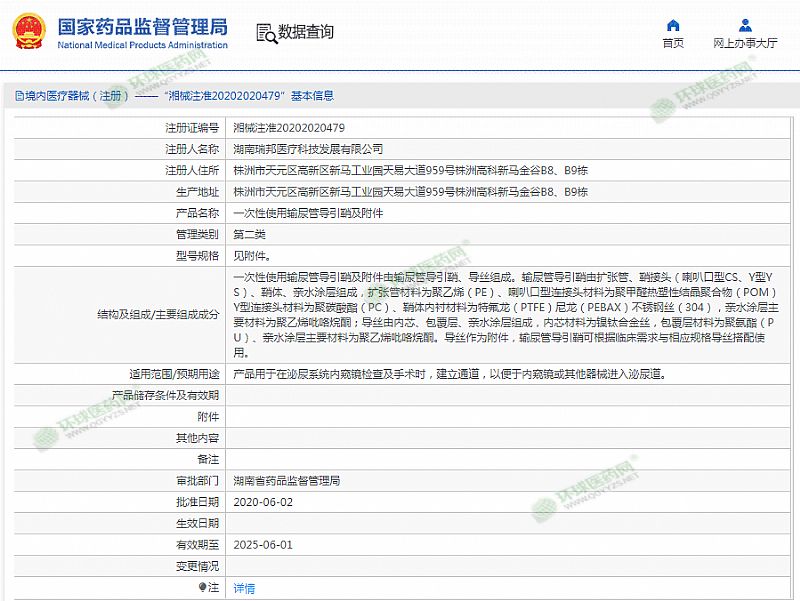 | 產(chǎn)品用途 | 產(chǎn)品用于在泌尿系統(tǒng)內(nèi)窺鏡檢查及手術(shù)時(shí),建立通道,以便于內(nèi)窺鏡或其他器械進(jìn)入泌尿道。 有效期至 2025-06-01 |