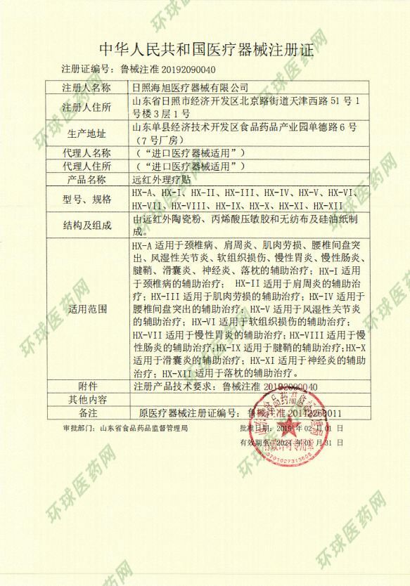 | 補(bǔ)充說明 | 【產(chǎn)品名稱】遠(yuǎn)紅外理療貼 【產(chǎn)品結(jié)構(gòu)】遠(yuǎn)紅外理療貼由遠(yuǎn)紅外陶瓷粉.丙烯酸壓敏膠和無紡布及硅油紙組成。 【適用范圍】適用于頸椎病、肩周炎、肌肉勞損、腰椎間盤突出、風(fēng)濕性關(guān)節(jié)炎、軟組織損傷、慢性胃炎、慢性腸炎、腱鞘炎、滑囊炎、神經(jīng)炎、落枕的輔助治療。 【使用方法】清潔患處,取出貼劑揭開防粘層,將膠面貼于患處,輕輕按壓即可,每24小時(shí)更換一次。 【禁 忌 癥】皮膚病、急性期炎癥患者、皮膚潰爛處、孕婦下腹部禁用。 【貯 存】密封,置陰涼干燥處保存 【執(zhí)行標(biāo)準(zhǔn)】YZB/魯0192-2011 【生產(chǎn)許可】魯食藥監(jiān)械生產(chǎn)許20110057號(hào) 【注冊(cè)證號(hào)】魯食藥監(jiān)械(準(zhǔn))字2014第2260011號(hào) 【規(guī) 格】7cm×10cm×3貼×2袋 【生 產(chǎn)】日照海旭醫(yī)療器械有限公司 【地 址】莒縣城陽東工業(yè)園 |