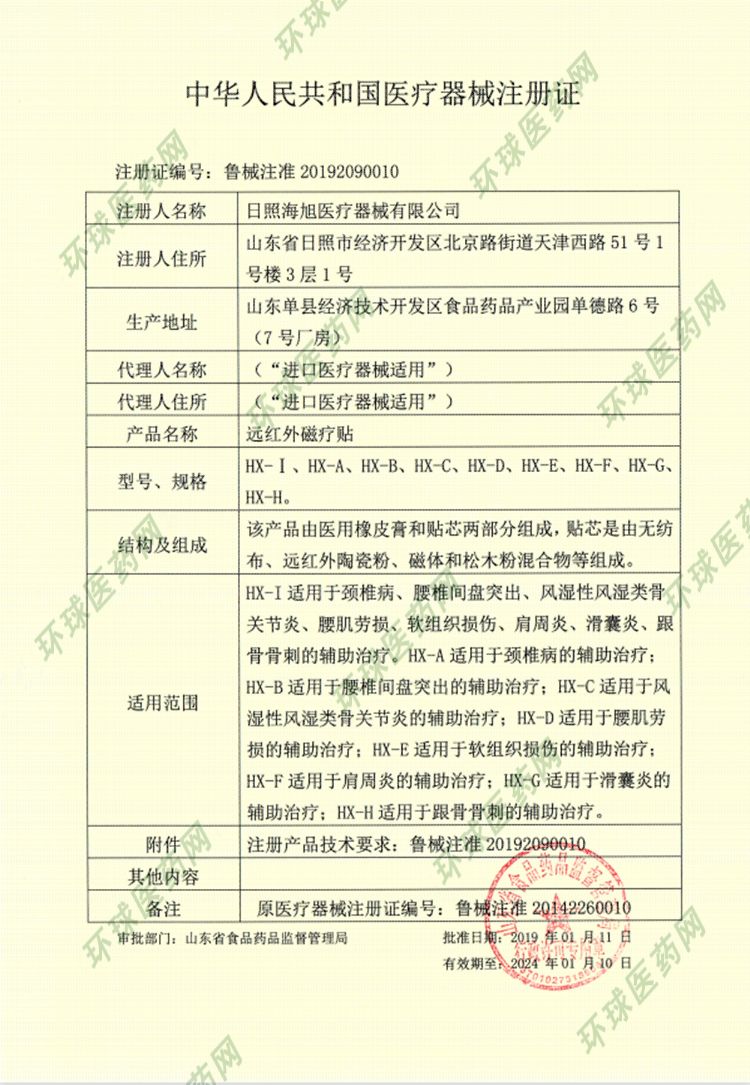 | 補(bǔ)充說明 | 【產(chǎn)品名稱】遠(yuǎn)紅外磁療貼 【產(chǎn)品結(jié)構(gòu)】該產(chǎn)品由醫(yī)用壓敏膠和貼芯、遠(yuǎn)紅外陶瓷粉、磁體等組成。 【適用范圍】適用于風(fēng)濕類風(fēng)濕關(guān)節(jié)炎的輔助治療。 【使用方法】使用本品時(shí),先清潔患部皮膚,揭去防粘膜將本品直接貼于患處,將膠膜緊貼皮膚并壓緊周邊,使粘貼材料貼實(shí)。2-3日更換一次。 【禁 忌 癥】局部皮膚破損、感染者、孕婦禁用;佩帶心臟起搏器者禁用皮膚過敏者慎用。 【貯 存】密封、置陰涼干燥處保存。 【執(zhí)行標(biāo)準(zhǔn)】YZB/魯0098-2008 【生產(chǎn)許可】魯食藥監(jiān)械生產(chǎn)許20110057號(hào) 【注冊(cè)證號(hào)】魯食藥監(jiān)械(準(zhǔn))字2014第2260010號(hào) 【規(guī) 格】9.5cm×13cm×1貼×3袋x300盒/件 【生 產(chǎn)】日照海旭醫(yī)療器械有限公司 【地 址】莒縣城陽(yáng)東工業(yè)園 【生產(chǎn)日期】見封口 【有效日期】二年 |