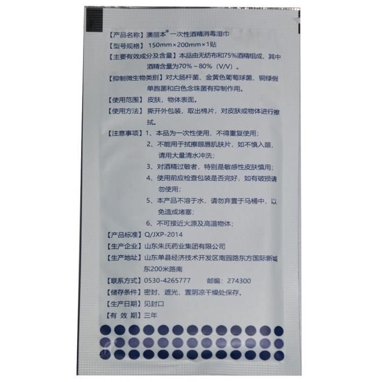 | 補充說明 | 【產(chǎn)品名稱】澳麗本一次性酒精消毒濕巾 【型號規(guī)格】150mmX200mmX1貼 【主要有效成分及含量】本品由無紡布和75%酒精組成,其中酒精含量為70% ~ 80% (V/V)。 【抑制微生物類別】對大腸桿菌、金黃色葡萄球菌、銅綠假單胞菌和白色念珠菌有抑制作用。 【使用范圍】皮膚,物體表面。 【使用方法】撕開外包裝,取出棉片,對皮膚或物體進行擦式。 【注意事項】 1、本品為一次性使用,不得重復(fù)使用 2、不能用于拭擦眼唇肌膚片,如不慎入眼,請用大量清水沖洗 3、對酒精過敏者,特別是敏感性皮膚慎用 4、使用前應(yīng)檢查包裝是否完好,如有破損請勿使用 5、本產(chǎn)品不溶于水,請勿棄置于馬桶中,以免造成堵塞 6、不可接近火源及高溫物體 【產(chǎn)品標準】Q/JXP-2014 【生產(chǎn)企業(yè)】日照海旭醫(yī)療器械有限公司 【生產(chǎn)地址】山東單縣經(jīng)濟技術(shù)開發(fā)區(qū)南園路東方國際新城東200米路南 【儲存條件】密封、遮光,置陰涼干燥處保存。 |
