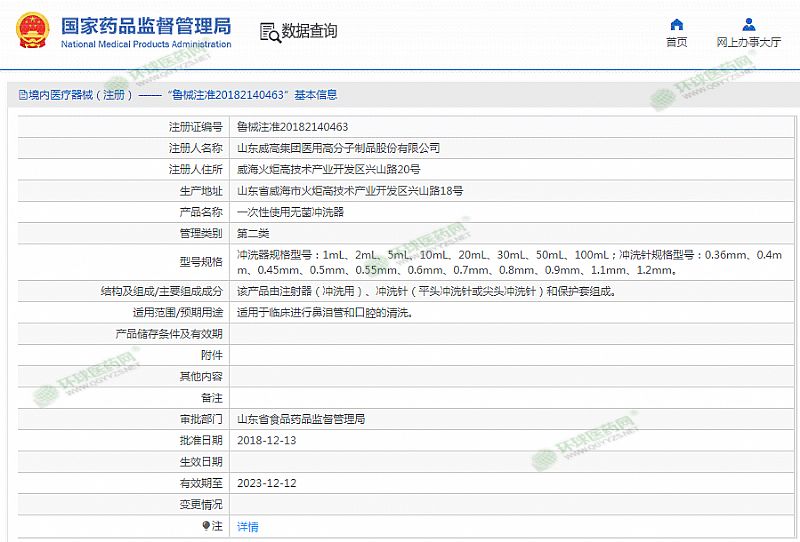| 產(chǎn)品用途 | 適用于臨床進行鼻淚管和口腔的清洗。 有效期至 2023-12-12 |