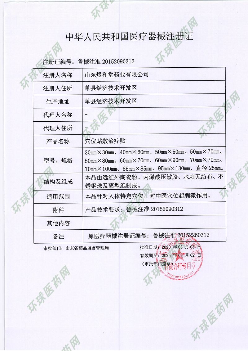 | 補充說明 | 使用說明 1、清潔相應穴位,先以拇指依次揉按相應穴位,每穴1~2分鐘,范圍由小到大,力量由輕到重,探尋敏感點。2、確認包裝無破損后,打開包裝,取出穴位貼敷治療貼,將貼劑的隔離膜撕去,以鋼珠對準相應穴位敏感點貼壓,1片/穴、 天,每日適度按壓3~5次,每次3~5分鐘,1個療程為10天,療程間隔2~3天。 禁忌癥 孕婦、皮膚潰爛處禁用。 慎 用 糖尿病、高熱患者。. 注意事項 1、僅限一次性使用,用后銷毀; 2、叮囑患者定時按壓,按壓不能過度用力,以不損傷皮膚為宜; 3、無粘性、包裝破損或過有效期禁止使用; 4、夏季多汗,宜勤換; 5、敷貼后如有過敏等不適,應停止敷貼。 儲存條件 本產(chǎn)品應貯存在相對濕度不超過80%,無腐蝕性氣體、陰涼、干燥、通風良好、清潔的環(huán)境內(nèi)。 [產(chǎn)品技術要求編號]魯械注準20152260316 [注冊證編號]魯械注準20152260316 [生產(chǎn)許可證號]魯食藥監(jiān)械生產(chǎn)許20130128號 [規(guī) 格] 70mmX 70mm [注冊人名稱/生產(chǎn)企業(yè)/售后服務機構]濟南康民藥業(yè)科技有限公司. [生產(chǎn)地址]山東單縣經(jīng)濟技術開發(fā)區(qū)食品藥品產(chǎn)業(yè)園單德路6號(3號廠房) [注冊人住所/注冊地址]濟南市市中區(qū)濟南萬達商業(yè)廣場4號商業(yè)辦公樓502室 廠子直銷低價批發(fā)、代理,可OEM/貼牌代加工 |