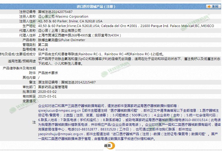 生產(chǎn)企業(yè): 邁心諾公司 Masimo Corporation