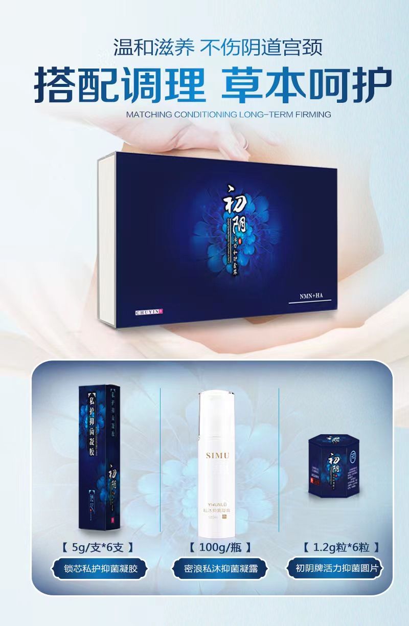 | 產(chǎn)品規(guī)格 | 初陰牌活力抑菌圓片1.2g/粒*6粒 鎖芯私護(hù)抑菌凝膠5g/支*6支 密浪私沐抑菌凝露100g |