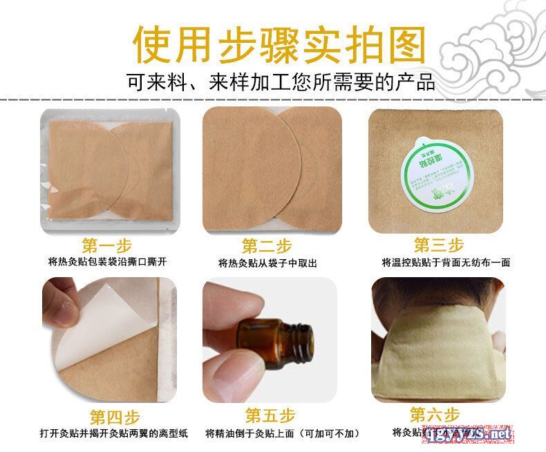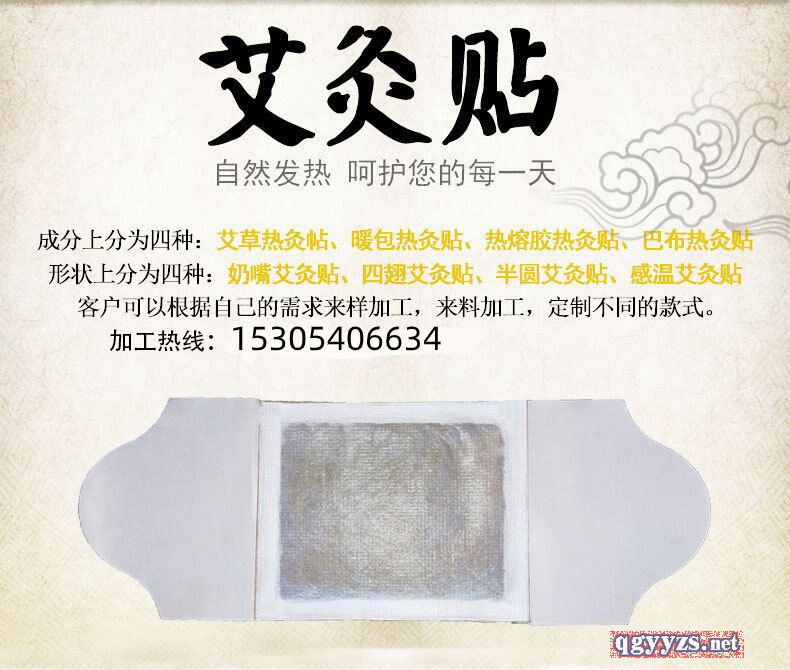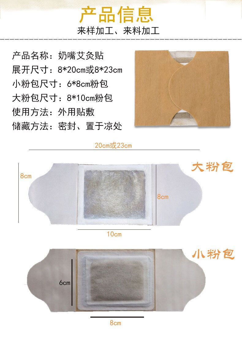 | 產(chǎn)品用途 | 產(chǎn)品名稱:奶嘴艾灸貼 展開尺寸:8*20cm或8*23cm 小粉包尺寸:6*8cm粉包 大粉包尺寸:8*10cm粉包 使用方法:外用貼敷 儲(chǔ)藏方法:密封、置于涼處 您還在用幾千年前的艾灸方法嗎? 新款艾灸貼,告別煙熏火燎的傳統(tǒng)艾灸 |