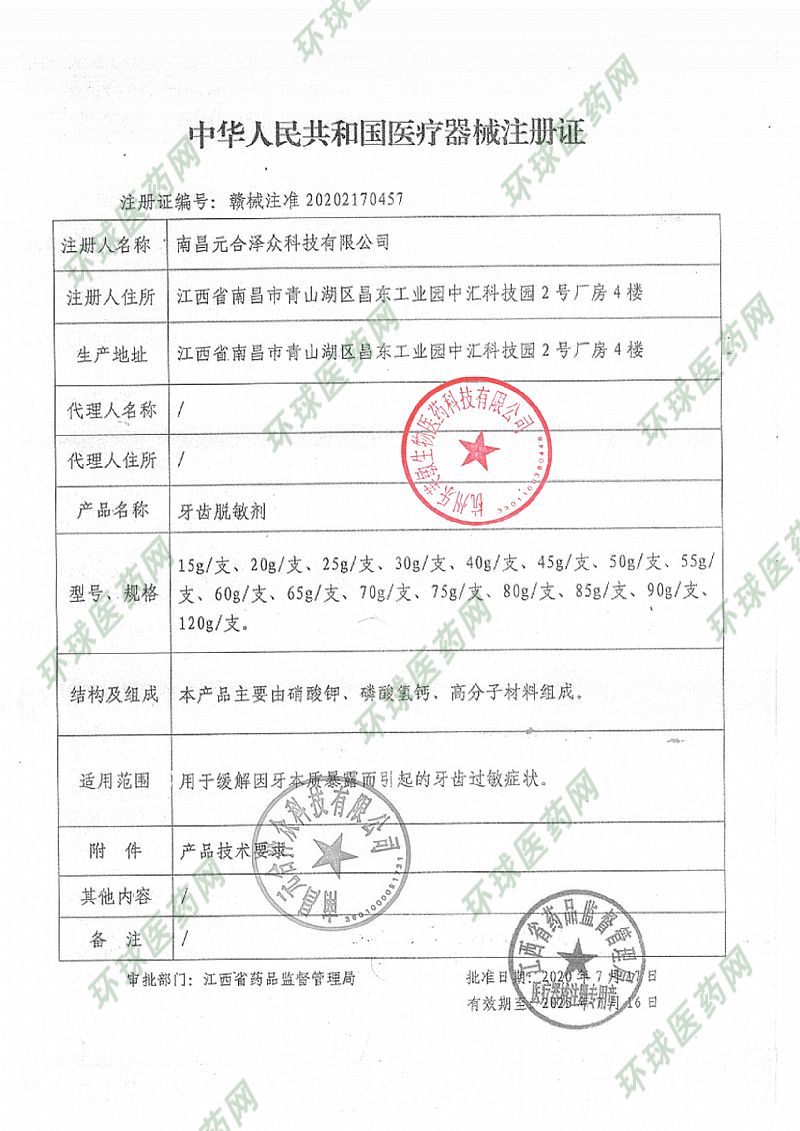 | 補充說明 | 【產(chǎn)品注冊證號】贛械注準20202170457 【產(chǎn)品技術(shù)要求編號】贛械注準20202170457 【生產(chǎn)許可證號】贛食藥監(jiān)械生產(chǎn)許20160095號 【注冊人/生產(chǎn)企業(yè)/售后服務(wù)單位】南昌元合澤眾科技有限公司 |