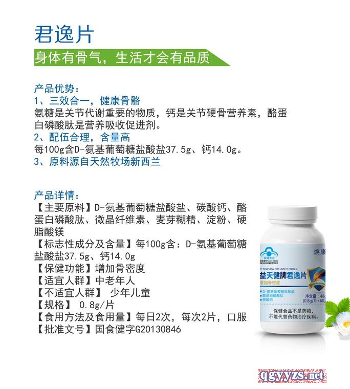 | 補(bǔ)充說明 | 1、氨糖是形成軟骨細(xì)胞的重要營養(yǎng)素之一,也是軟骨基質(zhì)和關(guān)節(jié)液的基本成分。有助于修復(fù)關(guān)節(jié)軟骨,催生和補(bǔ)充關(guān)節(jié)滑液,清楚關(guān)節(jié)腔垃圾,提高骨骼免疫力。2、鈣是**人體骨骼和牙齒健康的一種必要的礦物質(zhì),骨鈣的數(shù)量減少了,骨的堅(jiān)實(shí)程度自然會(huì)下降。所以維持骨健康,要適量補(bǔ)鈣。3、酪蛋白磷酸肽能使游離鈣保持較高的濃度,促進(jìn)鈣的被動(dòng)吸收。 產(chǎn)品優(yōu)勢 1. 高含量:標(biāo)志性成分:1,每100g含:D-氨基葡萄糖鹽酸鹽37.5g;鈣14.0g; 2. 氨基葡萄糖鹽酸鹽:能促進(jìn)人體粘多糖的合成,提高關(guān)節(jié)滑液的粘性,能改善關(guān)節(jié)軟骨的代謝 3. 鈣含量高,補(bǔ)充鈣元素 4. 酪蛋白磷酸肽促進(jìn)鈣吸收 5. 增加骨密度,—修復(fù)軟骨,強(qiáng)健骨骼! 6. 原料源自天然牧場新西蘭 7. 全國**產(chǎn)品 8. 國家食品藥品監(jiān)督管理局批注的保健食品,功能成分以及含量都有嚴(yán)格的執(zhí)行標(biāo)準(zhǔn) 9. 新產(chǎn)品上市全國招商 10. 銷量好,產(chǎn)品**高 規(guī)格:0.8g一片 【主要原料】D-氨基葡萄糖鹽酸鹽、碳酸鈣、酪蛋白磷酸肽、微晶纖維素、麥芽糊精、淀粉、硬脂酸鎂 【標(biāo)志性成分及含量】每100g含:D-氨基葡萄糖鹽酸鹽37.5、鈣14.0g 【保健功能】具有增加骨密度的保健功能 【適宜人群】中老年人 【食用方法及食用量】每日2次,每次2片,口服 【產(chǎn)品規(guī)格】0.8g/片 【保質(zhì)期】24個(gè)月 【貯藏方法】密封,常溫干燥處保存 【批準(zhǔn)文號(hào)】國食健字G20130846 【生產(chǎn)商】山東健康源生物工程有限公司 |