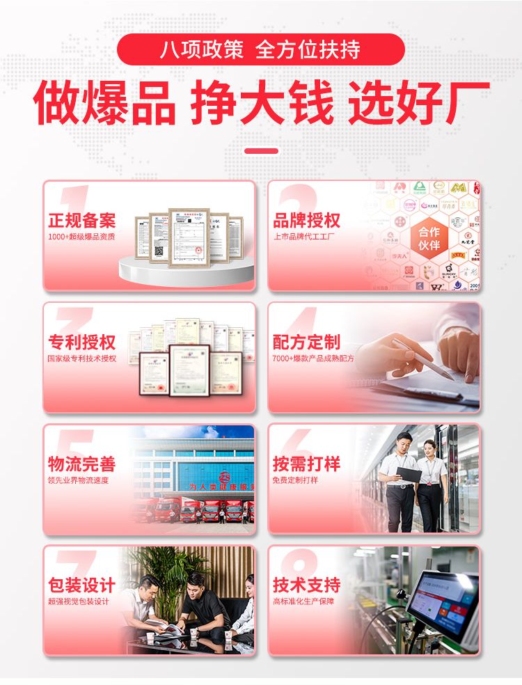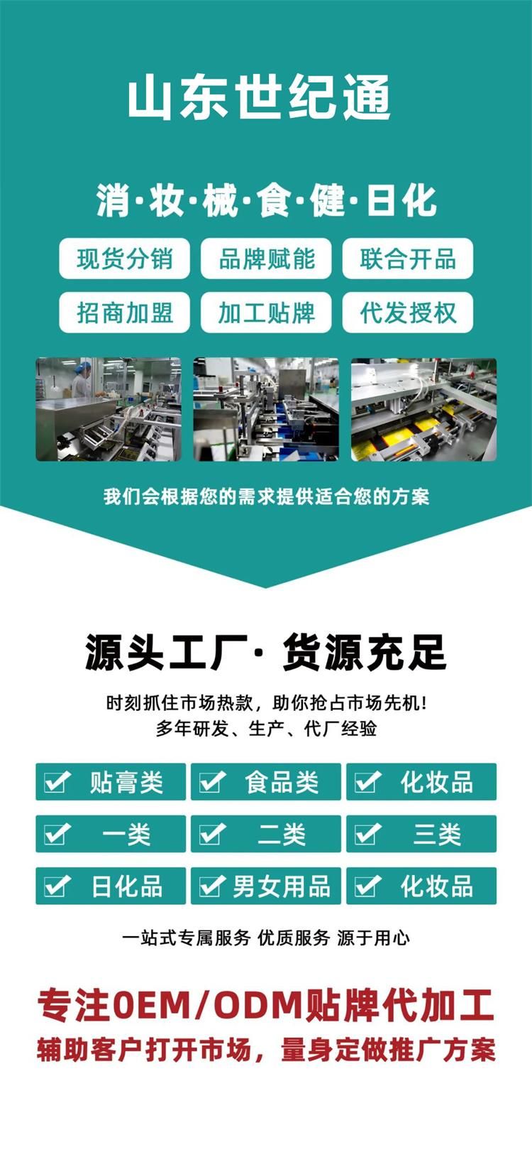 | 補充說明 | 注意事項:1市場大:膏藥的空白市場很大, 消費群體廣大。每個人都可能用到膏藥,并且有嚴格的區(qū)域保護。 2經(jīng)營活:可以自己在電商、微信上賣,可以做直播、短視頻,也可以和各大醫(yī)院、藥店、美容店合作。 3品種多:膏藥有:骨科、兒科、婦科、癥狀類等。化妝品有面膜、精華液、水乳霜、彩妝、套盒、洗沐護等。 4操作易:專業(yè)的客服團隊每月定期回訪,根據(jù)不同市場提供指導(dǎo)、培訓(xùn)、廣告、促銷活動支持! 貯藏:干燥陰涼 禁忌:無 保質(zhì)期:兩年 備注:1、優(yōu)質(zhì)服務(wù):專業(yè)OEM服務(wù)團隊一對一服務(wù),從設(shè)計到出貨全程專人跟進。 2、出貨迅速:包裝定稿,專業(yè)生產(chǎn)團隊可在10—15天內(nèi)交付發(fā)貨。 3、質(zhì)量**:從生產(chǎn)至出廠五道質(zhì)檢嚴格把關(guān),全自動四邊封口機器密封性更好,產(chǎn)品更美觀 4、權(quán)威認證:國家FDA認證的一類醫(yī)療器械文號,藥監(jiān)局可查,十萬級凈化標(biāo)準(zhǔn)生產(chǎn)車間,品質(zhì)有**。 5、經(jīng)驗豐富:20年生產(chǎn)加工經(jīng)驗,已為上百個品牌提供服務(wù),產(chǎn)品已出口多個國家和地區(qū)。 6、產(chǎn)量充足:現(xiàn)代化生產(chǎn)車間、進口全自動生產(chǎn)線,日產(chǎn)量100萬片。 7、品類齊全:300多款成熟配方(妝字號、械字號、消字號)免費打樣 |