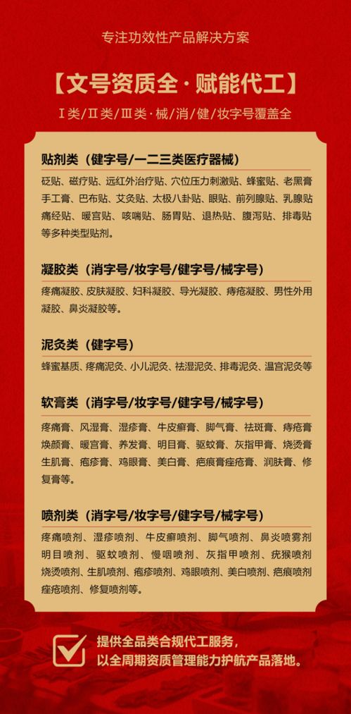 | 補充說明 | 注意事項:1市場大:膏藥的空白市場很大, 消費群體廣大。每個人都可能用到膏藥,并且有嚴格的區(qū)域保護。 2經(jīng)營活:可以自己在電商、微信上賣,可以做直播、短視頻,也可以和各大醫(yī)院、藥店、美容店合作。 3品種多:膏藥有:骨科、兒科、婦科、癥狀類等;瘖y品有面膜、精華液、水乳霜、彩妝、套盒、洗沐護等。 4操作易:專業(yè)的客服團隊每月定期回訪,根據(jù)不同市場提供指導、培訓、廣告、促銷活動支持! 貯藏:干燥陰涼 禁忌:無 保質(zhì)期:兩年 備注:1、優(yōu)質(zhì)服務:專業(yè)OEM服務團隊一對一服務,從設(shè)計到出貨全程專人跟進。 2、出貨迅速:包裝定稿,專業(yè)生產(chǎn)團隊可在10—15天內(nèi)交付發(fā)貨。 3、質(zhì)量**:從生產(chǎn)至出廠五道質(zhì)檢嚴格把關(guān),全自動四邊封口機器密封性更好,產(chǎn)品更美觀 4、權(quán)威認證:國家FDA認證的一類醫(yī)療器械文號,藥監(jiān)局可查,十萬級凈化標準生產(chǎn)車間,品質(zhì)有**。 5、經(jīng)驗豐富:20年生產(chǎn)加工經(jīng)驗,已為上百個品牌提供服務,產(chǎn)品已出口多個國家和地區(qū)。 6、產(chǎn)量充足:現(xiàn)代化生產(chǎn)車間、進口全自動生產(chǎn)線,日產(chǎn)量100萬片。 7、品類齊全:300多款成熟配方(妝字號、械字號、消字號)免費打樣 |
