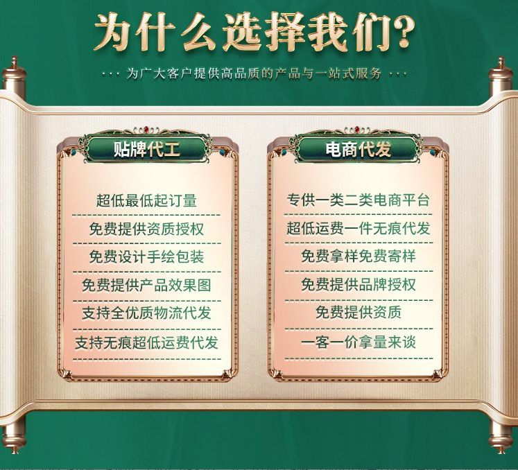 | 補(bǔ)充說(shuō)明 | 注意事項(xiàng):1市場(chǎng)大:膏藥的空白市場(chǎng)很大, 消費(fèi)群體廣大。每個(gè)人都可能用到膏藥,并且有嚴(yán)格的區(qū)域保護(hù)。 2經(jīng)營(yíng)活:可以自己在電商、微信上賣,可以做直播、短視頻,也可以和各大醫(yī)院、藥店、美容店合作。 3品種多:膏藥有:骨科、兒科、婦科、癥狀類等;瘖y品有面膜、精華液、水乳霜、彩妝、套盒、洗沐護(hù)等。 4操作易:專業(yè)的客服團(tuán)隊(duì)每月定期回訪,根據(jù)不同市場(chǎng)提供指導(dǎo)、培訓(xùn)、廣告、促銷活動(dòng)支持! 貯藏:干燥陰涼 禁忌:無(wú) 保質(zhì)期:兩年 備注:1、優(yōu)質(zhì)服務(wù):專業(yè)OEM服務(wù)團(tuán)隊(duì)一對(duì)一服務(wù),從設(shè)計(jì)到出貨全程專人跟進(jìn)。 2、出貨迅速:包裝定稿,專業(yè)生產(chǎn)團(tuán)隊(duì)可在10—15天內(nèi)交付發(fā)貨。 3、質(zhì)量**:從生產(chǎn)至出廠五道質(zhì)檢嚴(yán)格把關(guān),全自動(dòng)四邊封口機(jī)器密封性更好,產(chǎn)品更美觀 4、權(quán)威認(rèn)證:國(guó)家FDA認(rèn)證的一類醫(yī)療器械文號(hào),藥監(jiān)局可查,十萬(wàn)級(jí)凈化標(biāo)準(zhǔn)生產(chǎn)車間,品質(zhì)有**。 5、經(jīng)驗(yàn)豐富:20年生產(chǎn)加工經(jīng)驗(yàn),已為上百個(gè)品牌提供服務(wù),產(chǎn)品已出口多個(gè)國(guó)家和地區(qū)。 6、產(chǎn)量充足:現(xiàn)代化生產(chǎn)車間、進(jìn)口全自動(dòng)生產(chǎn)線,日產(chǎn)量100萬(wàn)片。 7、品類齊全:300多款成熟配方(妝字號(hào)、械字號(hào)、消字號(hào))免費(fèi)打樣 |