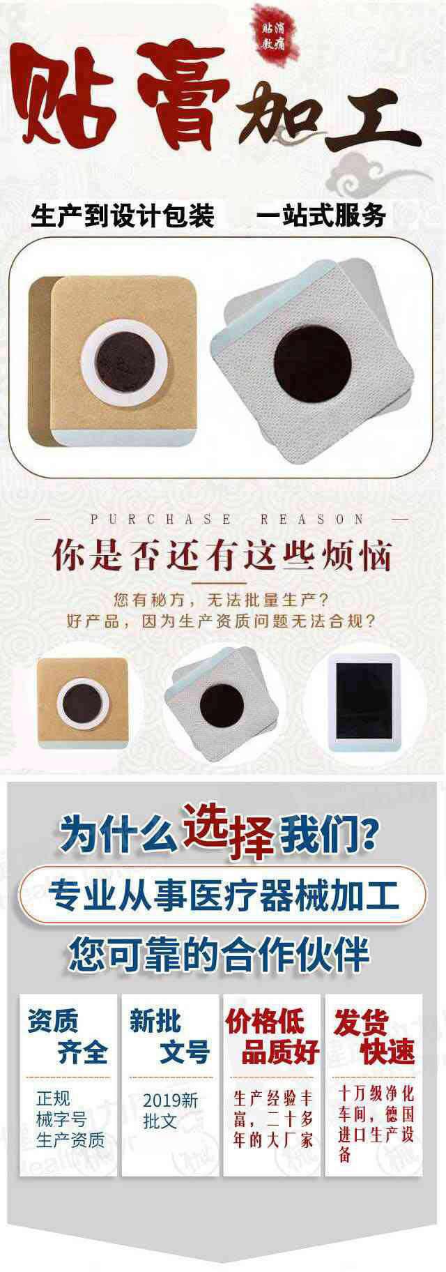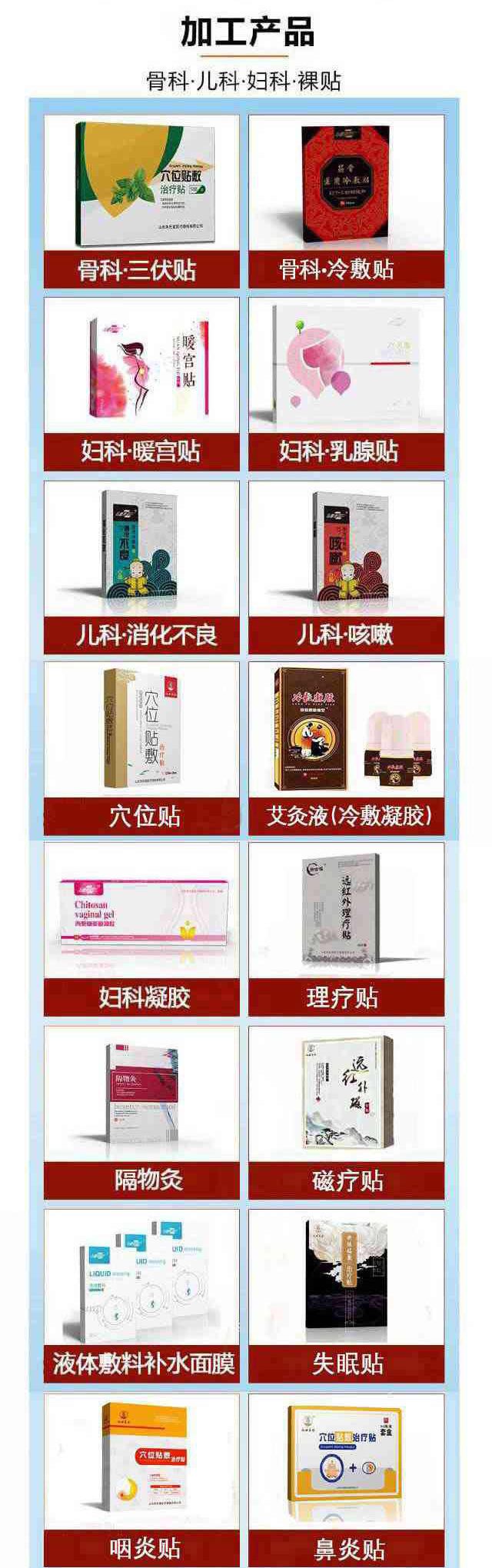 | 補(bǔ)充說明 | 貼代牌加工,形狀規(guī)格大小可定制 產(chǎn)品系列:各類貼劑、膏劑、膏藥、消毒消用殺品、化妝品、保健食品、日化用品、保健產(chǎn)品、臨床產(chǎn)品、耗材列系等 |