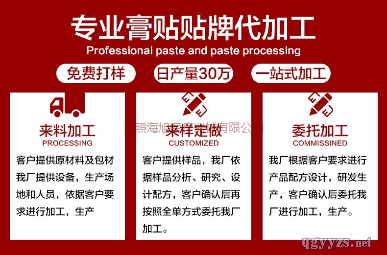 | 產(chǎn)品用途 | 膏藥代加工企業(yè)膏藥廠膏藥加工 1:免熬膏藥基質(zhì)生產(chǎn)方便,不含鉛丹,但是易造成污染,運(yùn)輸,貯存不方便,且生產(chǎn)成本高。,3:溶劑型熱熔壓敏膠膏藥基質(zhì),持久性好,但膏藥生產(chǎn)工藝復(fù)雜,成本高,污染大。 廠家免費(fèi)熱線:18678567207(同微信)高經(jīng)理 海旭醫(yī)療黑膏藥貼牌產(chǎn)品優(yōu)勢:1、海旭膏藥有消腫、拔毒、生肌、除寒等效果。2、深層穴位滲透,通經(jīng)舒絡(luò)、行氣活血、消炎止痛,達(dá)到強(qiáng)筋健骨之功效。3、通過材料刺激,形成神經(jīng)條件反射,調(diào)節(jié)機(jī)體功能,促進(jìn)抗體形成,提高人體免疫力。4、營養(yǎng)、修復(fù)病變的細(xì)胞,鈍化骨刺、消除腫脹、解除僵硬狀態(tài)。5、刺激關(guān)節(jié)軟骨組織,肌肉骨骼免疫功能得到恢復(fù),骨關(guān)節(jié)疾病逐步康復(fù),活動(dòng)自如。6、調(diào)節(jié)氣血,平衡陰陽;促進(jìn)新陳代謝,增強(qiáng)關(guān)節(jié)功能,日照海旭醫(yī)療器械有限公司黑膏藥廠家。主要生產(chǎn),黑膏貼,紅外理療貼、磁療貼、穴位敷貼、灸熱貼、退熱貼、燙熨治療包、中醫(yī)穴位透皮貼,沙蒿子透皮貼、輸液加溫貼、無菌敷貼等醫(yī)院和終端產(chǎn)品 |