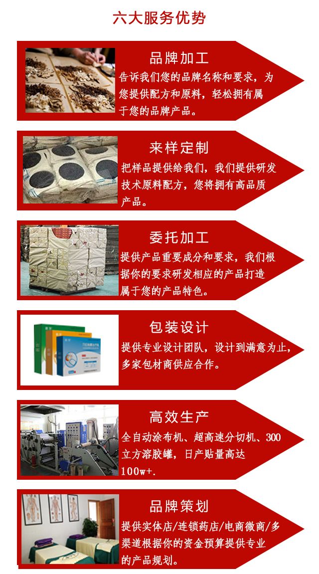| 其它說(shuō)明 | 山東朱氏藥業(yè)專注膏藥代加工廠家,專對(duì)骨科、內(nèi)科、婦科等外用膏藥,穴位貼、黑膏貼、冷敷貼、熱可貼、肚臍貼、疤痕貼、退熱貼、退燒貼、暖宮貼、痛經(jīng)貼、前列腺貼、水凝膠、足貼、熱奄包、隔物灸、遠(yuǎn)紅外理療貼、保健食品、化妝品等上百種產(chǎn)品貼牌代加工!我們以產(chǎn)品良好的市場(chǎng)潛力、多形式的合作方式、優(yōu)惠的銷售政策、以優(yōu)越的條件、優(yōu)惠的價(jià)格、的服務(wù),歡迎洽談合作!機(jī)會(huì)不能錯(cuò)過(guò),您的電話進(jìn)來(lái),**問(wèn)題我們幫您解答。 |