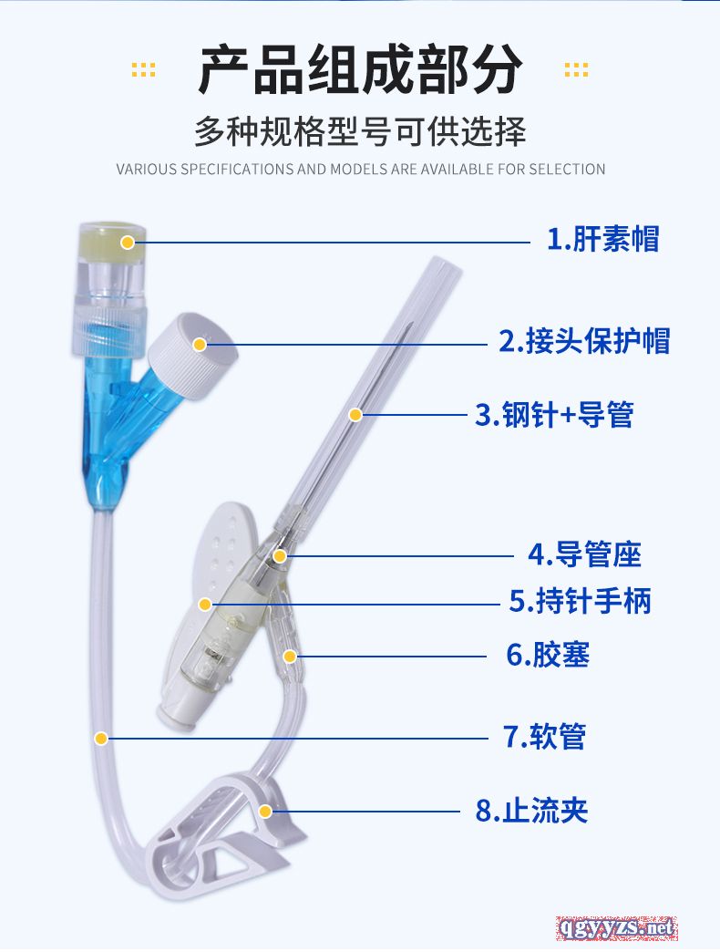 | 主要成分 | Y型留置針主要由不銹鋼針管、導管(套管)、金屬楔、導管座(Y型)、隔離塞、針管座、長導管(連接管)、長導管連接座、肝素帽、螺旋帽、滑動夾緊板、針管保護套組成。 |