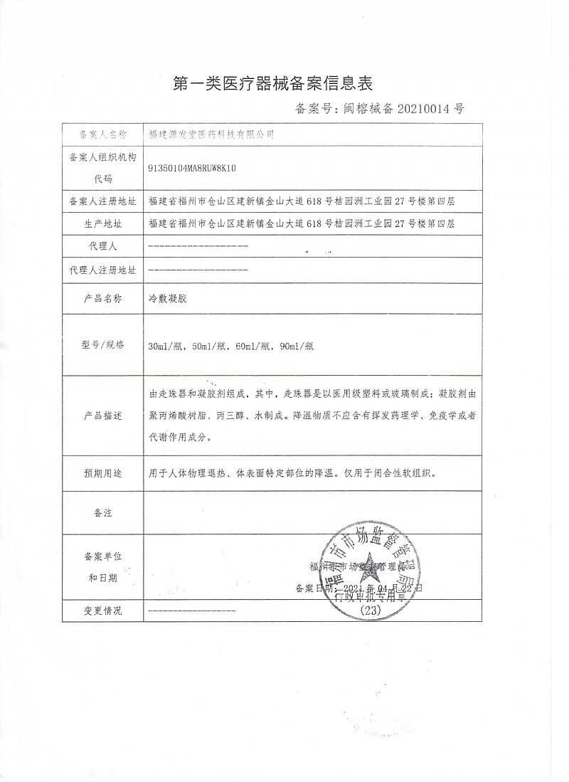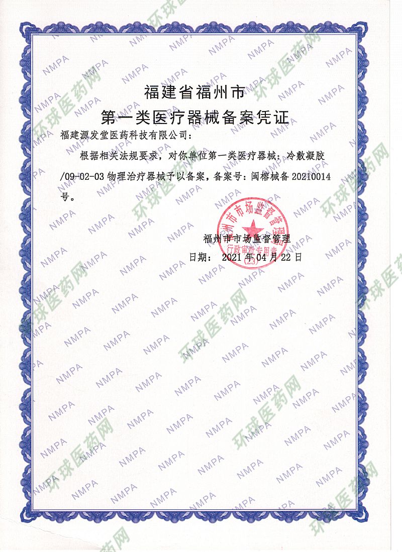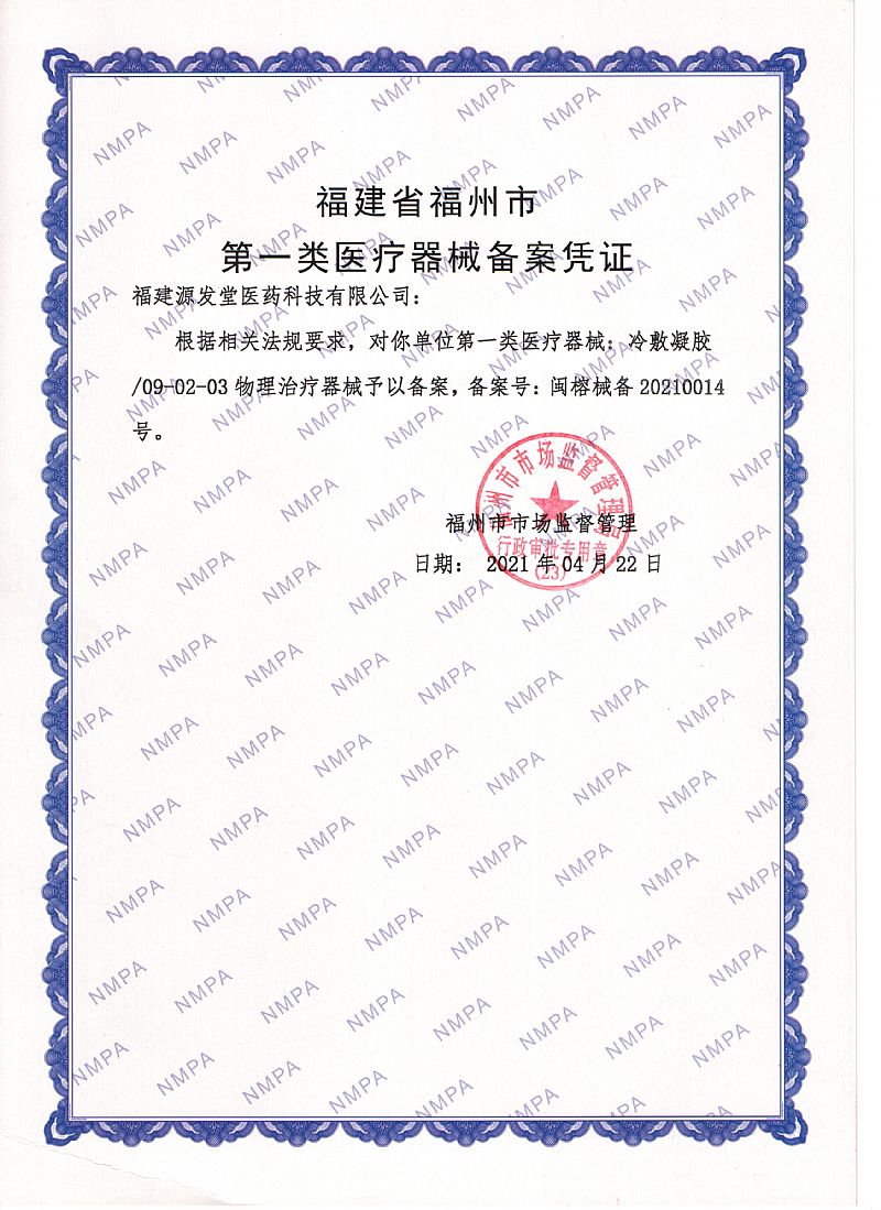 | 補充說明 | 福建源發(fā)堂醫(yī)藥科有限公司前身為江西源發(fā)藥店,成立至今已近百年歷史。醫(yī)保產(chǎn)品醫(yī)用退熱貼(專利號:ZL 2021 3 0527751.X)、退熱走珠(冷敷凝膠)、退熱雙寶為公司拳頭產(chǎn)品,具有退燒迅速,冷敷持續(xù)性長,產(chǎn)品可靠性高、有效性強的特點。 |