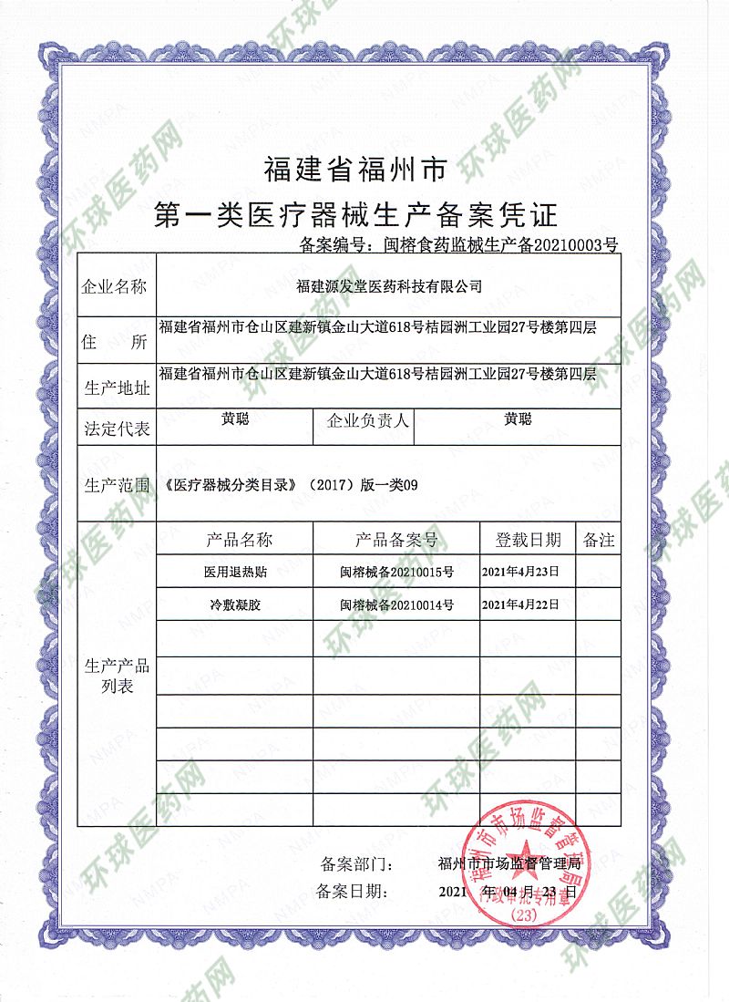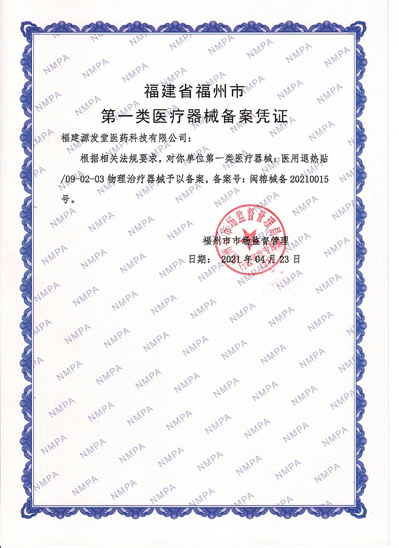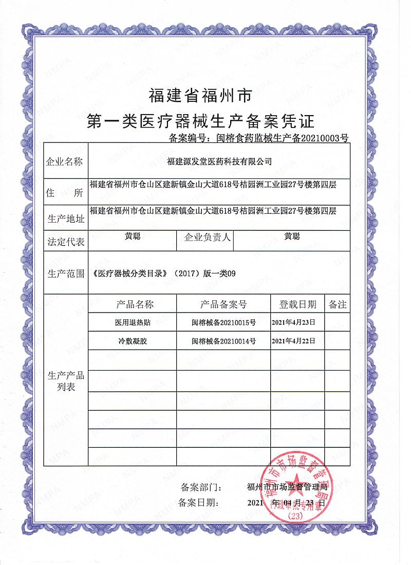 | 補(bǔ)充說明 | 福建源發(fā)堂醫(yī)藥科有限公司前身為江西源發(fā)藥店,成立至今已近百年歷史。醫(yī)保產(chǎn)品醫(yī)用退熱貼(專利號(hào):ZL 2021 3 0527751.X)、退熱走珠(冷敷凝膠)、退熱雙寶為公司拳頭產(chǎn)品,結(jié)合現(xiàn)代科研成果研發(fā)而來,具有退燒迅速,冷敷持續(xù)性長,產(chǎn)品可靠性高、有效性強(qiáng)的特點(diǎn)。 |