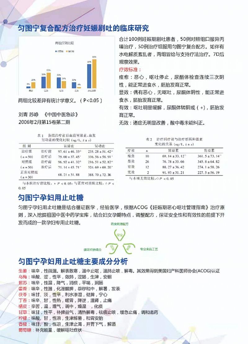 | 作用機(jī)理 | 勻圖寧的十味藥食同源配方遵循了經(jīng)典的“君一,臣三,佐五,使一”的原則,(即君臣佐使)。生姜溫中止嘔為君,藿香化濕醒脾,丁香暖胃降逆,茯苓利水滲濕為臣,烏梅斂肺澀腸,紫蘇行氣和胃,橘皮理氣調(diào)中,檸檬和胃安胎,香橙開(kāi)胃下氣為佐,葡萄糖和胃潤(rùn)肺,調(diào)和諸藥為使。同時(shí),生姜,丁香,藿香,紫蘇,橘皮五味偏溫,茯苓,烏梅,香橙,檸檬,葡萄糖五味平?jīng),各自結(jié)合,組方便溫而不燥,平而不涼,故有從容之號(hào),更適合孕婦服用。 |
