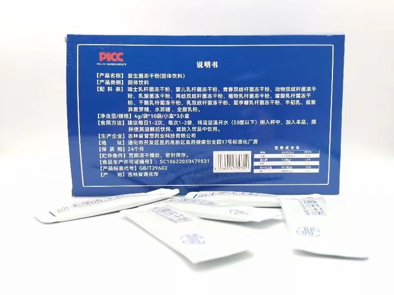 | 主要成分 | 瑞士乳桿菌凍干粉,嬰兒乳桿菌凍干粉,青春雙歧桿菌凍干粉,動物雙歧桿菌凍干粉,乳酸菌凍干粉,兩歧雙歧桿菌凍干粉,植物乳桿菌凍干粉,嗜酸乳桿菌凍干粉,干酪乳桿菌凍干粉,乳雙歧桿菌凍干粉,鼠李糖乳桿菌凍干粉,牛初乳,低聚異麥芽糖,水蘇糖,全脂乳粉。 |