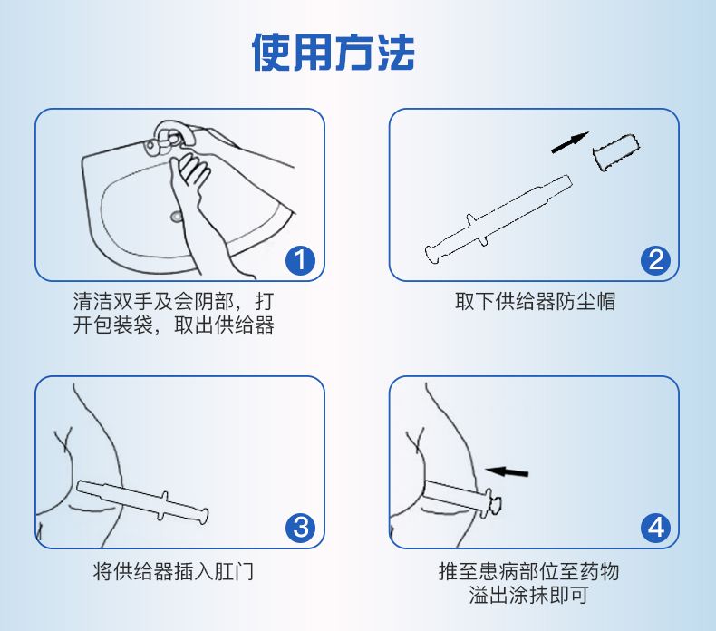 | 使用方法 | 取出凝膠管,取下防塵帽,將供給器插入肛門,推至患病部位至藥物溢出涂抹即可 |