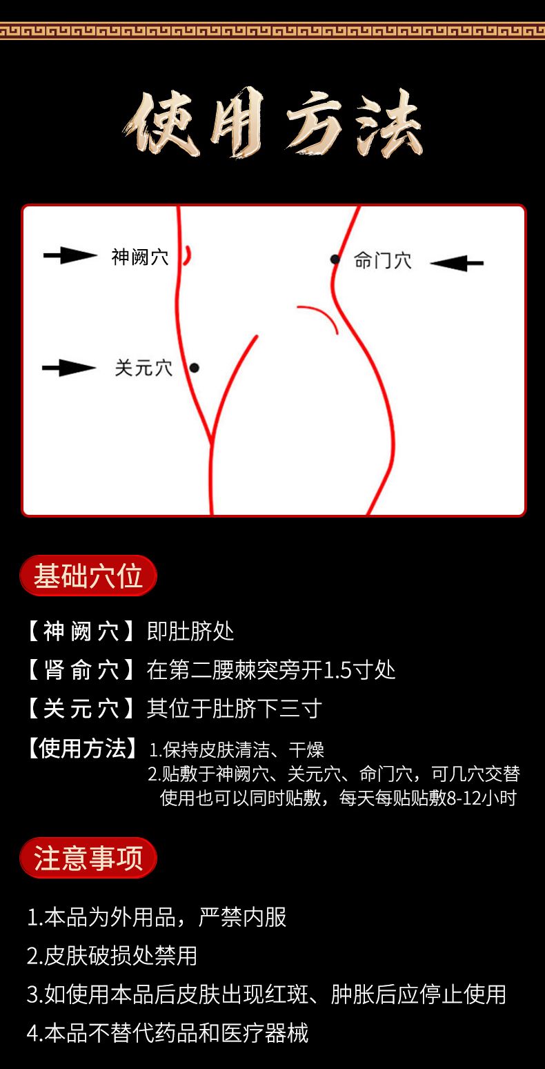 | 使用方法 | 【使用方法】1.保持皮膚清潔、干燥 2.貼敷于神闕穴、關(guān)元穴、命門穴,可幾穴交替使用也可以同時(shí)貼敷,每天每貼貼敷8-12小時(shí) |