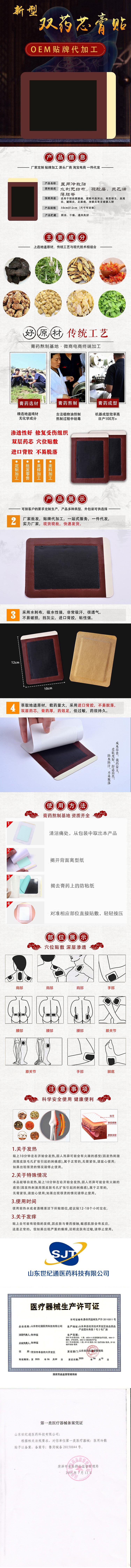 | 補充說明 | 1、傳統(tǒng)黑膏藥加工OEM貼牌是中醫(yī)的黑膏藥,精選五十六味名貴中藥熬制而成。百年多的歷史,數(shù)萬康復(fù)患者驗證,黑膏藥烏黑亮澤、黏而不粘、穿透力強(qiáng)、吸收快、療效高、不流不掉、不污衣物,一年四季均可貼敷。 2、內(nèi)病外治,施藥于皮膚,通過反射、滲透、吸收及輸布,快速實現(xiàn)局部治療效果與整體治療效應(yīng)。直接作用患處,靶向治療,吸收更多,作用更充分,明顯優(yōu)于口服藥。且無口服藥物之弊端。 3、治病兩處貼針對腰椎間盤突出、頸椎病、椎管狹窄、采用治病兩處貼、獨特的穴位療法,在大椎穴和雙肩井穴或腰椎部位和臀部環(huán)跳穴各敷一貼,上下作用合力袪除病灶,使患有頸腰椎病引起的肢體麻木、疼痛的患者迅速康復(fù)。 4、調(diào)和陰陽、標(biāo)本兼治,黑膏藥加工貼牌是根據(jù)中藥當(dāng)歸原理,運用藥物互相協(xié)調(diào)為用的效能,組成多味藥物的復(fù)方,其覆蓋穴位多,強(qiáng)力吸收,起效快,在性強(qiáng)的前提下得到患者認(rèn)可的。 5、載藥量大,藥效更高膏體烏黑亮澤、油潤細(xì)膩,選用五十六味名貴中藥熬制而成,輻射面廣,是一般膏體面的3-5倍,1貼頂10貼。能快速、持久地透皮釋放膏體中有效成份,體現(xiàn)出了傳統(tǒng)膏藥標(biāo)本兼治的特殊功效,使藥效發(fā)揮更為**,一貼管7天,藥效更持久,藥力更強(qiáng)效。 6、使用**,*****純中藥、純手工、純棉布精心制成,針對患病部位內(nèi)病外治、局部施治,避免了藥物對肝臟及其他器官的毒副作用。不刺激皮膚,不致敏,無任何毒副作用,費用又低廉,消費者可完全放心地進(jìn)行治療。 7、適應(yīng)癥廣,使用方便適用于頸椎病、腰椎病、肩周炎、膝關(guān)節(jié)病、骨質(zhì)增生、椎管狹窄、椎間盤突出、膨出、骨刺、等**風(fēng)濕骨病,不打針、不吃藥、不手術(shù),效果好,費用低。 1, 黑膏藥加工;黑色藥心、紅色藥心、綠色藥心、黃色藥心等材質(zhì)可分無紡布、水刺布、pu膜防水布,規(guī)格尺寸多樣,可隨意調(diào)整。另:可來料加工或傳統(tǒng)黑膏藥加工。特殊規(guī)格及樣式皆可定做。 2, 巴布貼膏藥加工;紅膠巴布貼、綠膠巴布貼、透明色膠巴布貼、黑膠巴布貼,布質(zhì)可分為無紡布及水刺布。主要規(guī)格;7*10cm 8*10cm 8*11cm 9X12cm 10x12cm 11X14cm 3, 粉包劑膏藥加工;藥袋+低忖+藥水袋,藥袋內(nèi)含全天然中藥粉共40余味,藥水袋內(nèi)含天然植物提取液,使用時,揭開背忖層,將藥水均勻灑在藥包上。 4, 巴布劑膏藥加工;科技浸膏,純中藥提取,新型劑型,載藥量是傳統(tǒng)膏藥數(shù)十倍,運用新透皮吸收技術(shù),可反復(fù)帖敷,療效佳,規(guī)格多樣可調(diào)整。 5, 橡膠膏加工;彈力布橡膠膏及仿彈力橡膠膏,主要顏色為;膚色、白色。主要規(guī)格;7*10cm、8*13cm 6, 水凝膠膏藥加工:凝膠貼劑加工,可加工退熱貼,風(fēng)濕貼劑,加入中藥粉攪拌做成風(fēng)濕骨病貼劑,載藥量大,主要規(guī)格5X7cm,4X11cm,5X12cm |