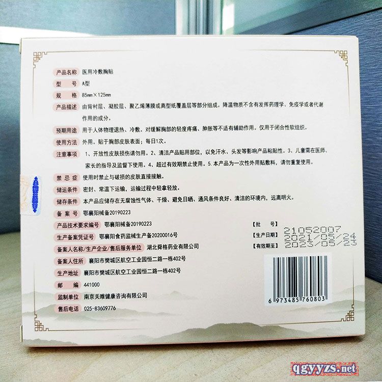 | 補(bǔ)充說明 | 【產(chǎn)品名稱】醫(yī)用冷敷胸貼 【產(chǎn)品規(guī)格】85mm*125mm 【結(jié)構(gòu)組成】由無(wú)紡布被襯層,凝膠層,聚乙烯薄膜覆蓋層組成、降溫物質(zhì)不應(yīng)含有發(fā)揮藥理學(xué),免疫學(xué)或者代謝作用的成分 【適用范圍】用于人體物理退熱,冷敷,對(duì)緩解胸部的輕度疼痛,腫脹等不適有輔助作用,僅用于閉合性軟組織 【使用方法】外用,貼于胸部皮膚表面,每日一次 【注意事項(xiàng)】1.開放性皮膚損傷請(qǐng)勿用;2.清潔產(chǎn)品貼用部位,以免汗水,頭發(fā)等影響產(chǎn)品粘性3.兒童需在醫(yī)師家長(zhǎng)的指導(dǎo) 及監(jiān)督下使用。4.超過有效期禁止使用5.本產(chǎn)品為一次性外用貼敷料,請(qǐng)勿重復(fù)使用 【禁忌 癥 】孕婦,皮膚潰爛處禁用 【慎 用】糖尿病,高熱患者 【貯 存】密封,常溫下貯存,常溫下運(yùn)輸,運(yùn)輸過程中輕拿輕放 【備案號(hào) 】鄂襄陽(yáng)械備20190223 【生產(chǎn)廠家】濟(jì)南秦魯藥業(yè)科技有限公司 |