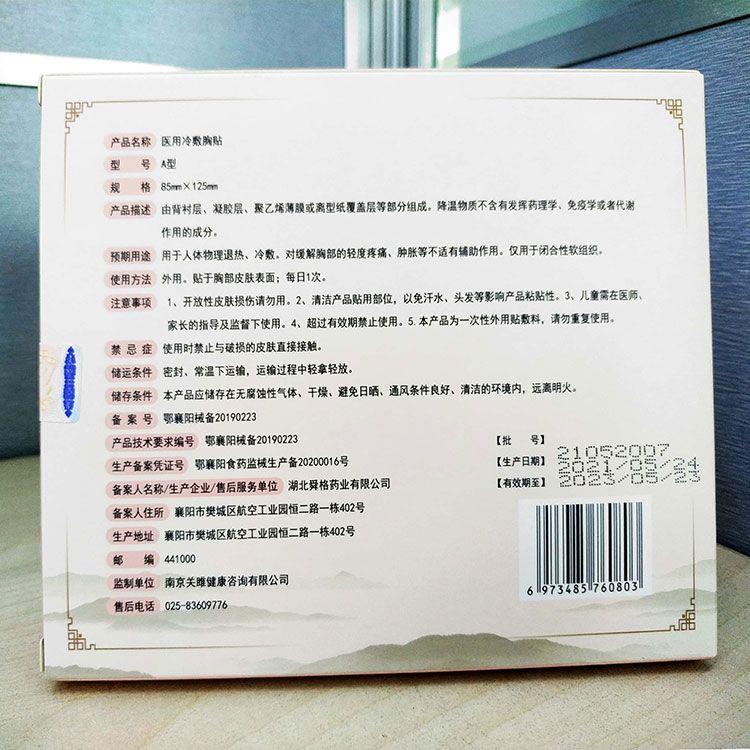 | 產(chǎn)品用途 | 用于人體物理退熱,冷敷,對(duì)緩解胸部的輕度疼痛,腫脹等不適有輔助作用,僅用于閉合性軟組織 |