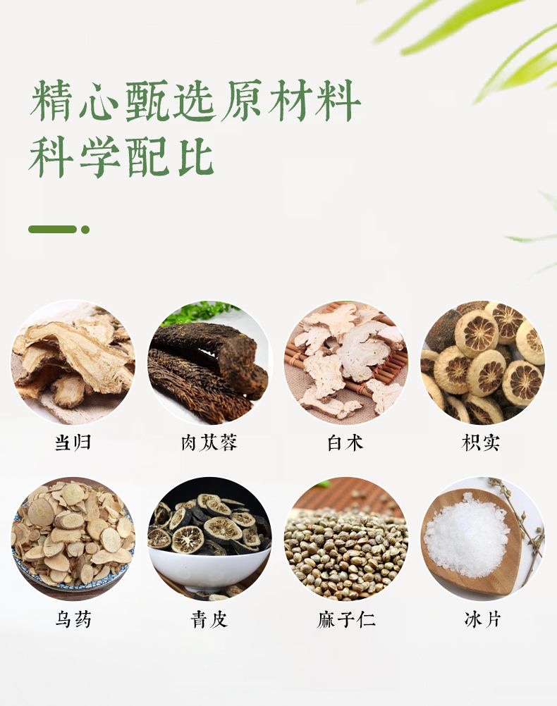 | 主要成分 | 本品以當(dāng)歸、肉從蓉、白術(shù)、枳實(shí)烏藥、青皮、麻子仁、冰片、熱熔膠為原料經(jīng)加工而成。 |