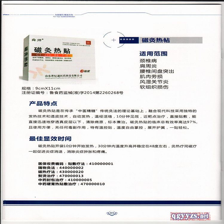 作用機(jī)理 灸療、磁療、遠(yuǎn)紅外療與穴位協(xié)同。發(fā)熱溫度可達(dá)60度,發(fā)熱時(shí)間8----12小時(shí)(強(qiáng)效型12小時(shí)、舒適型8小時(shí)),比其他產(chǎn)品平均高5度以上,在此發(fā)熱溫度的持續(xù)刺激下,可使體表溫度升高3---8度,真正起到溫經(jīng)活絡(luò)、祛濕止痛的作用。