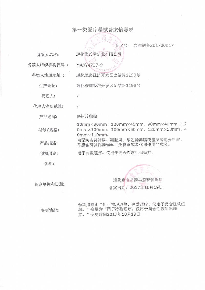| 補充說明 | 【性能及主要結(jié)構(gòu)】本品由無紡布背襯層、凝膠層、聚乙烯薄膜覆蓋層等部分組成。不應含有發(fā)揮藥理學、免疫學或者代謝作用的成分。 【預期用途】用于冷數(shù)理療。僅用于閉合性軟組織理療。 【注意事項】1.本品為局部外用。適用于骨病關(guān)節(jié)炎、網(wǎng)球肘、腱銷炎、滑膜炎、頸椎病、肩周炎、腰椎間盤突出、跌打損傷、骨質(zhì)增生、靜脈曲張、落枕、腰腿疼痛,肌肉疼痛,足跟炎痛,骨折、坐骨神經(jīng)痛引起的紅腫熱痛等需要冷敷理療的人群。 2.本品適用于完整皮膚,不可用于皮膚破損處。 3.本品不適用于過敏體質(zhì)的,孕婦、哺乳期婦女、嬰幼兒。 4.貼后出現(xiàn)皮膚腫脹和發(fā)炎等異,F(xiàn)象,請立即停止使用。 【使用方法】打開包裝,取出冷數(shù)貼,揭去聚乙烯薄膜、防粘紙,將背襯層貼于患處,48小時更換一次,貼敷部位癥狀明顯可適當縮短貼敷時間,急性扭損傷應立即使用。 【保存方法】陰涼保存 【有 效 期】36個月 【產(chǎn)品備案號】吉通械備20170001號 【產(chǎn)品技術(shù)要求編號】吉通械備20170001號 【生產(chǎn)備案編號】吉通食藥監(jiān)械生產(chǎn)備20160002號 |