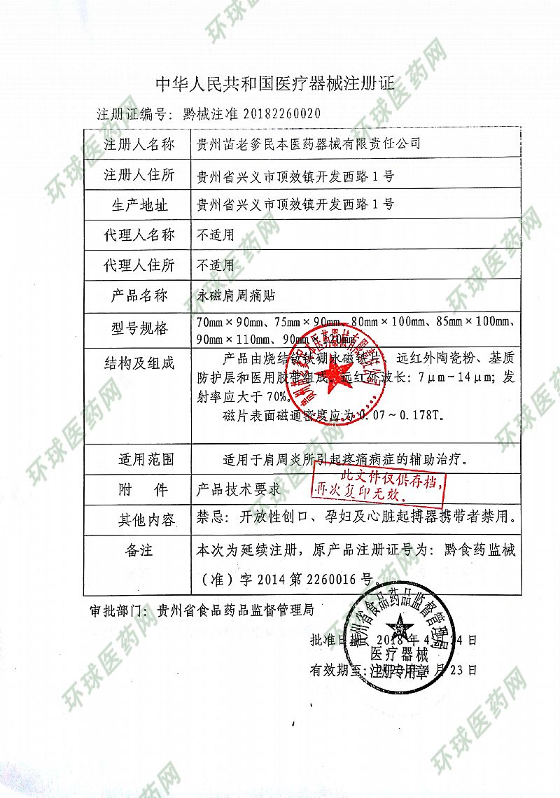 | 補(bǔ)充說(shuō)明 | 1、使用本品,若個(gè)別皮膚出現(xiàn)瘙癢或皮疹,應(yīng)立即停止使用即可。 2、使用或存放本品時(shí)應(yīng)遠(yuǎn)離磁卡和易受磁損壞物品;不要與帶金屬儀表的器械同時(shí)使用。 3、開(kāi)放性傷口、孕婦、兒童、心臟起搏器攜帶者和對(duì)磁療有明顯不良反應(yīng)者禁用。 4、置于干燥通風(fēng)處保存。 【售后服務(wù)單位】貴州苗老爹民本醫(yī)藥器械有限責(zé)任公司 【注冊(cè)人住所】貴州省興義市頂效鎮(zhèn)開(kāi)發(fā)西路1號(hào) |