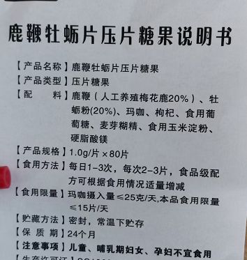 | 主要成分 | 產(chǎn)品名稱:鹿鞭牡蠣片 產(chǎn)品類型:壓片糖果 配料:鹿鞭(人工養(yǎng)殖梅花鹿20%),牡蠣粉20%,瑪咖,枸杞,食用葡萄糖,麥芽糊精、食用玉米淀粉、硬脂酸鎂。 產(chǎn)品規(guī)格:1g*80片/盒/ |