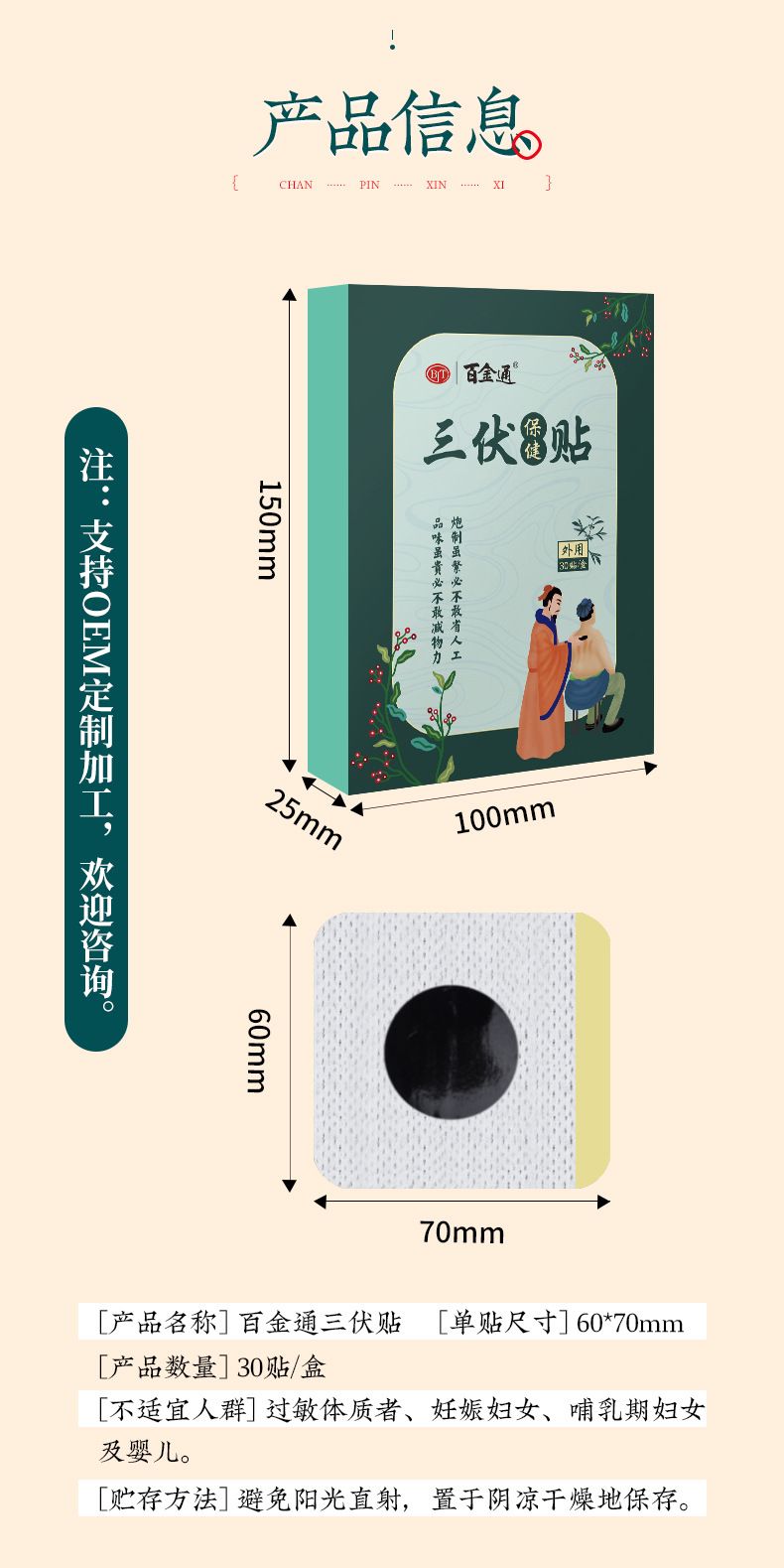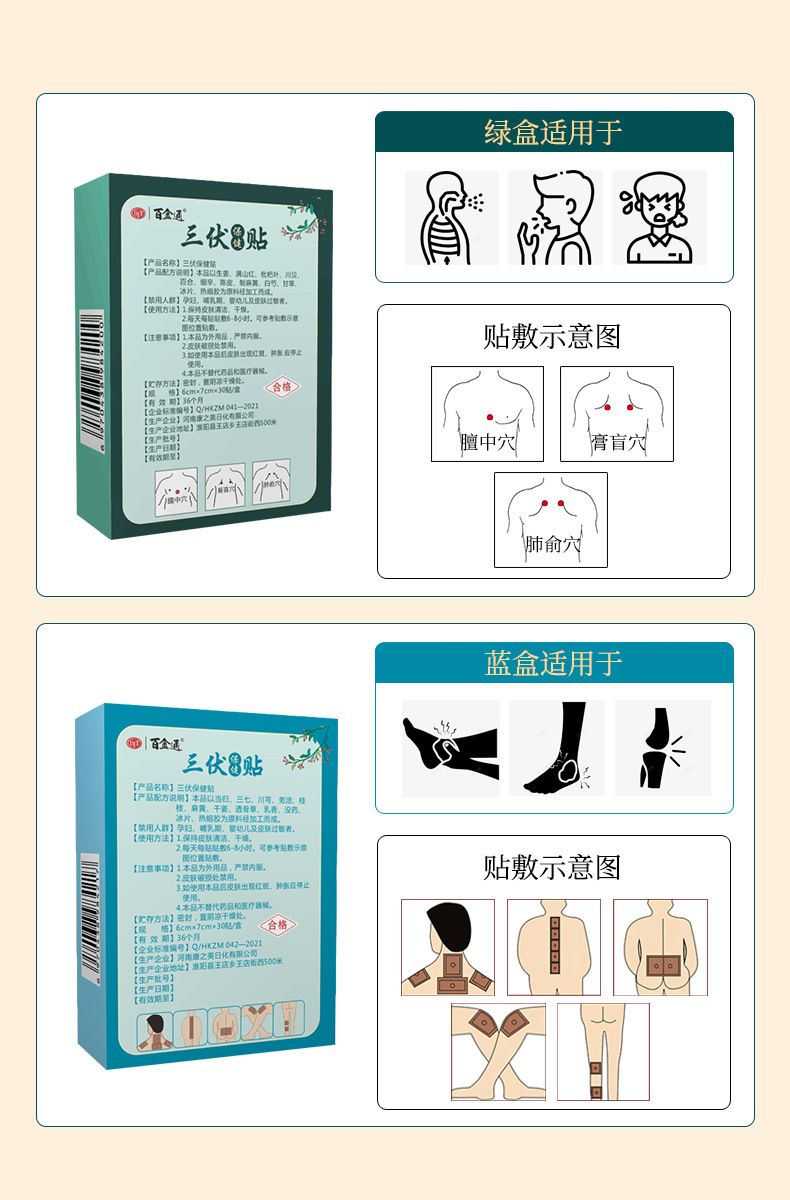 | 補(bǔ)充說明 | [產(chǎn)品各稱]百金通三伏貼―[單貼尺寸]60*70mm[產(chǎn)品數(shù)量]30貼/盒 [不適宜人群]過敏體質(zhì)者、妊娠婦女、哺乳期婦女及嬰兒。 [貯存方法]避免陽光直射,置于陰涼干燥地保存。 |