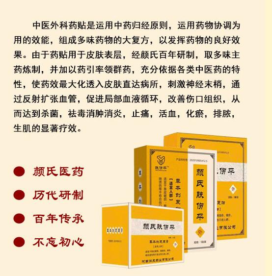| 其它說明 | 顏氏醫(yī)藥歷代傳承研制,經百年臨床治療,不斷完善和精細化,充分依據各類中醫(yī)藥的特性,古法熬制與現代工藝相結合,使藥效充分透入皮膚直達病所,刺激神經末梢,通過反射擴張血管,促進局部血液循環(huán),改善 傷口組織,從而達到殺菌,袪毒消腫消炎,止痛,活血,化瘀,排膿,生肌的療效。 |