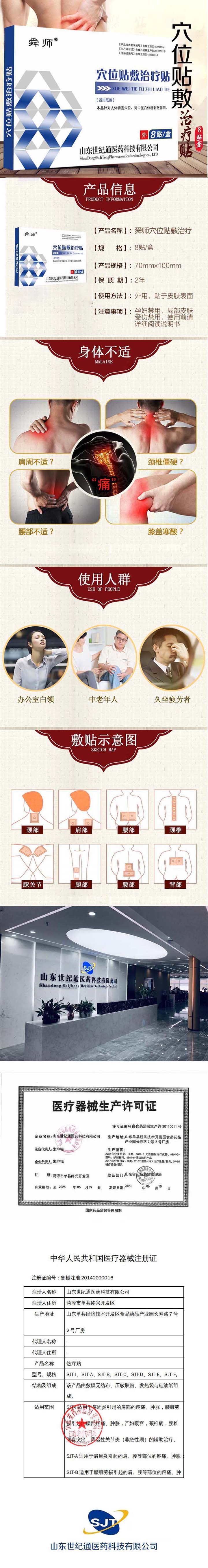 | 產(chǎn)品賣點(diǎn) | 門診輸液叫停,抗生素使用限制,國家已大力發(fā)展中醫(yī)藥。穴位貼敷療法歷史悠久,越來越多的高知人群和兒童家長,已經(jīng)意識到抗生素的危害,開始嘗試抗生素的替代方案,這也是穴位帖一上市就獲得關(guān)注和青睞的原因。山東世紀(jì)通醫(yī)藥科技,專業(yè)生產(chǎn)廠家,實(shí)力企業(yè),具有較高的品牌知名度、美譽(yù)度,質(zhì)量優(yōu)、價格優(yōu)、服務(wù)優(yōu)。 |