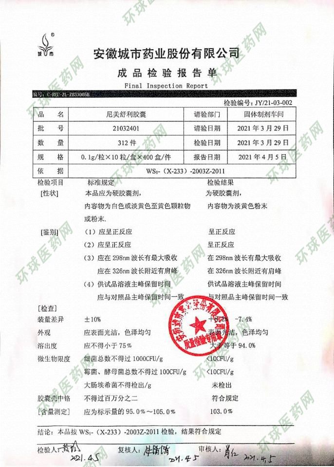 本品主要成份為尼美舒利。化學(xué)名稱:4-硝基-2-笨氧基甲烷磺酰苯胺。 |