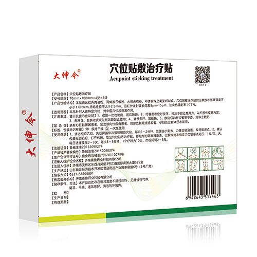 | 使用方法 | 1、清潔相應(yīng)穴位,先以拇指依次操按相應(yīng)穴位,每穴1~2分鐘,范圍由小到大,力量由輕到重,探尋敏感點。2、確認(rèn)包裝無破損后,打開包裝,取出穴位貼敷治療貼,將貼劑的隔離膜撕去,以鋼珠對準(zhǔn)相應(yīng)穴位敏感點貼壓,1片/穴、天,每日適度按壓3~5次,每次3~5分鐘,1個療程為10天,療程間隔2~3天。 |
