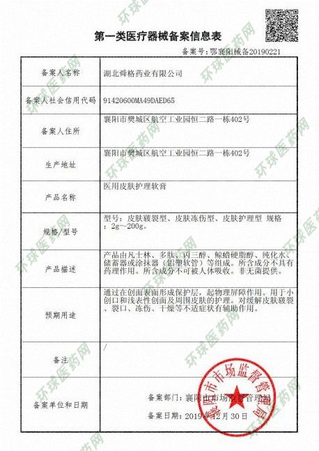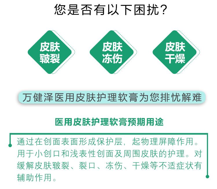 | 產(chǎn)品用途 | 用于小創(chuàng)口和淺表性創(chuàng)面及周圍皮膚的護(hù)理。對緩解皮膚皸裂、裂口、凍傷、干燥、瘙癢,濕疹、過敏、手足癬、燒傷等不適癥狀有輔助作用。 |