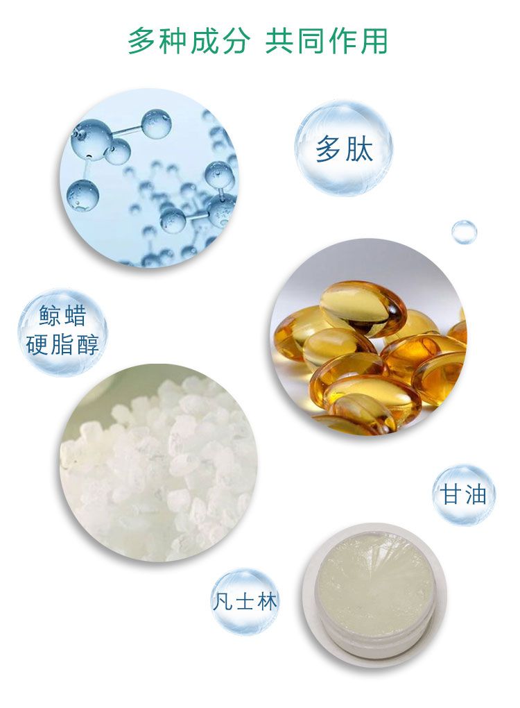 | 主要成分 | 產(chǎn)品由凡士林、多肽、丙三醇、鯨蠟硬脂醇、純凈水、儲(chǔ)蓄器或涂抹器(鋁塑軟管)等組成。所含成分不具有藥理作用。所含成分不可被人體吸收。非無菌提供。 |