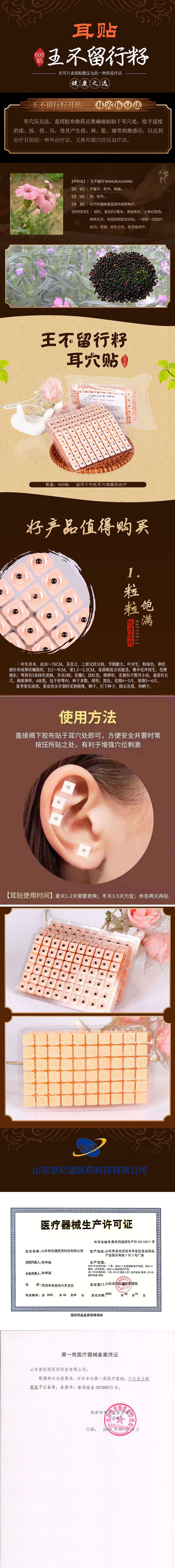 | 補(bǔ)充說明 | 王不留行籽是植物麥藍(lán)菜的成熟種子。多為,亦有栽培。夏季果實(shí)成熟、果皮尚未開裂時(shí)采割植株,曬干,打下種子,除去雜質(zhì),曬干生用或炒用,為王不留行籽;一般中醫(yī)針灸中用作耳針療法的材料,制成品為預(yù)裁為約5mm5mm大小的膠布,中間粘一粒王不留行籽,貼于耳朵,壓迫相應(yīng)穴位。 王不留行耳貼 1.首先,用酒精消毒耳朵后貼上王不留行,按壓時(shí)耳朵有酸、麻、脹、痛感,如沒有上述感覺,可把磁珠向上、向下、向左或向右稍加移動,找到敏感點(diǎn),再固定按壓,從而刺激經(jīng)絡(luò)穴位,達(dá)到治果。 2.將耳穴貼貼在治療點(diǎn)上,每次先做一邊耳朵,每天有規(guī)律用力適度的按壓刺激穴位,約3天后換另一邊耳朵繼續(xù)按壓,交替使用,以3-7天為一個療程,建議多3個療程為限,須休息一星期。 |
