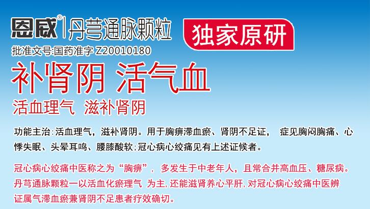 | 其它說明 | 丹芎通脈顆粒(國藥準字Z20010082,國藥證字Z20010068)是四川恩威中醫(yī)藥研究開發(fā)公司依據(jù)祖國醫(yī)學的傳統(tǒng)理論,對冠心病、心絞痛進行了深入細致的研究,并在總結我國古代傳統(tǒng)經驗處方的基礎上,研制出的對冠心病、高血壓、高血脂等疾病有較好療效,且未見明顯毒副作用的第三類中藥新藥。該藥具有理氣活血、補益心腎的作用,主治冠心病心絞痛。對冠心病心絞痛氣滯血瘀兼心腎陰虛患者療效確切。 |