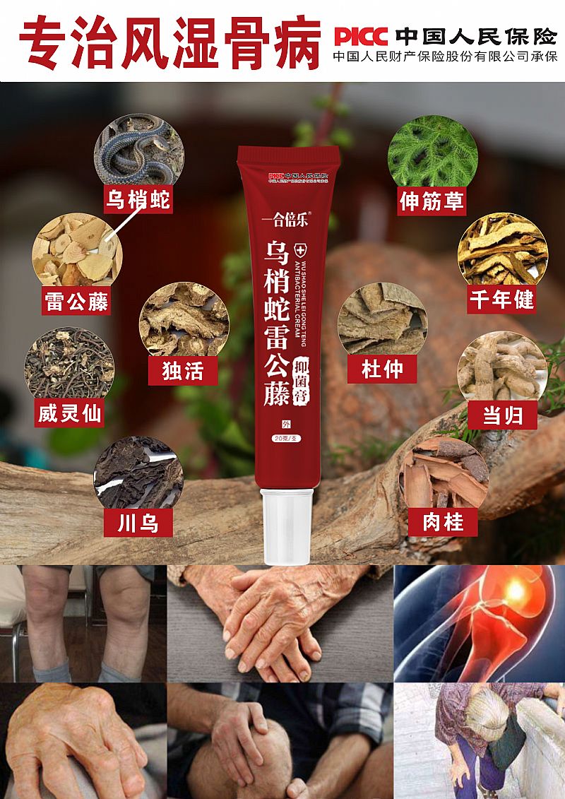 | 主要成分 | 烏梢蛇(Zoacys)10%、雷公藤(RadixetRhizomaTripterygii)10%、獨(dú)活(RadixAngelicaePubescentis)5%,威靈仙(RadixetRhizomaClematidis)6%,川烏(RadixAconiti)6%、伸筋草(HerbaLycopodii)10%、千年。℉omalomenaocculta)10%、杜仲(CortexEucommiae)5%、當(dāng)歸(RadixAngelicaeSinensis)5%、肉桂(CortexCinnamomi)4%。 |