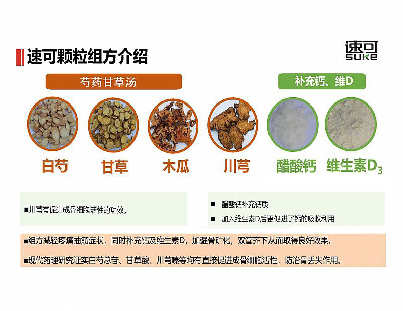 | 主要成分 | 中國發(fā)明專利配方:白芍、甘草、木瓜、川芎、醋酸鈣、維生素D3 |
