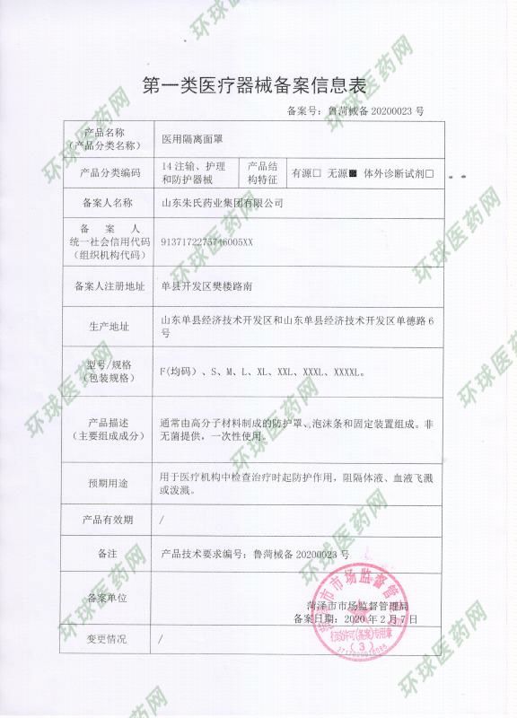 | 補(bǔ)充說明 | 冊(cè)證編號(hào)/備案號(hào) 魯菏械備20200023號(hào) 注冊(cè)人/備案人名稱 山東朱氏藥業(yè)集團(tuán)有限公司 注冊(cè)人住所/備案人注冊(cè)地址 單縣開發(fā)區(qū)樊樓路南 生產(chǎn)地址 山東單縣經(jīng)濟(jì)技術(shù)開發(fā)區(qū)和山東單縣經(jīng)濟(jì)技術(shù)開發(fā)區(qū)單德路6號(hào) 代理人名稱 代理人注冊(cè)地址 產(chǎn)品名稱 醫(yī)用隔離面罩 管理類別 **類 型號(hào)規(guī)格 F(均碼)、S、M、L、XL、XXL、XXXL、XXXXL。 結(jié)構(gòu)及組成/產(chǎn)品描述 通常由高分子材料制成的防護(hù)罩、泡沫條和固定裝置組成。非無菌提供,一次性使用。 適用范圍/預(yù)期用途 用于醫(yī)療機(jī)構(gòu)中檢查治療時(shí)起防護(hù)作用,阻隔體液、血液飛濺或潑濺。 附件 其他內(nèi)容 備注 審批部門/備案單位 山東省食品藥品監(jiān)督管理局 批準(zhǔn)/備案日期 2020-02-07 |