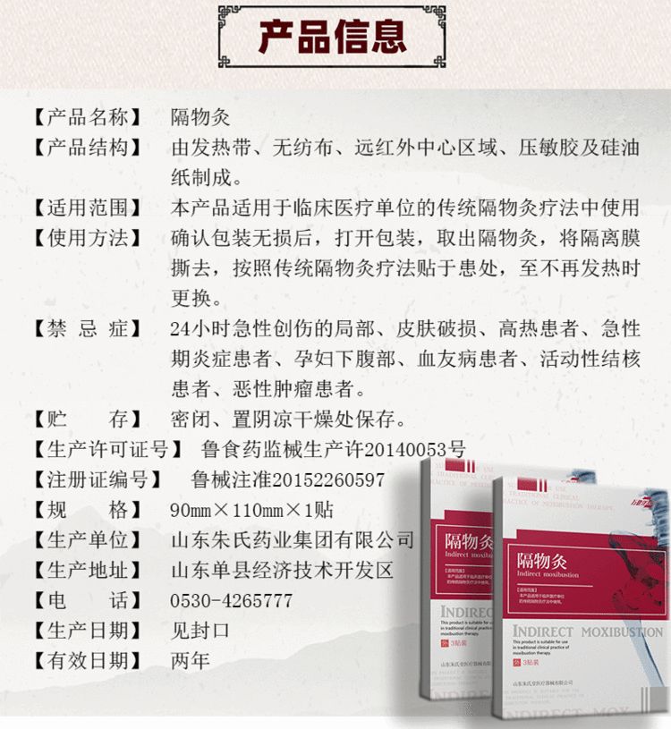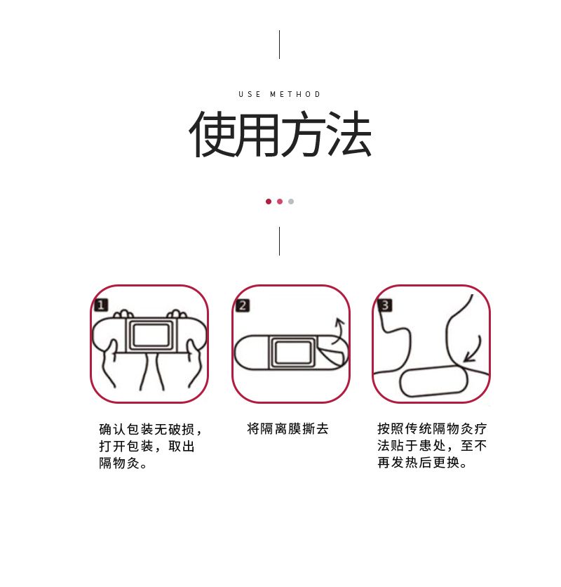| 使用方法 | 確認包裝無損后,打開包裝,取出隔物灸,將隔離膜撕去,按照傳統(tǒng)隔物灸療法貼于患處,至不再發(fā)熱時更換。 |