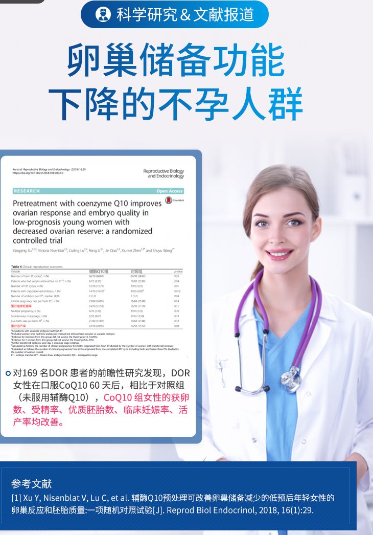 | 作用機理 | 輔酶Q10可以改善卵母細胞能量代謝;改善卵巢低反應(yīng);提高卵子質(zhì)量。 |